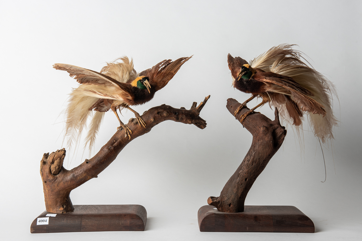 A PAIR OF MOUNTED BIRDS OF PARADISE, 40 CM TOTAL HEIGHT, LEONARD JOEL LOCAL DELIVERY SIZE: SMALL