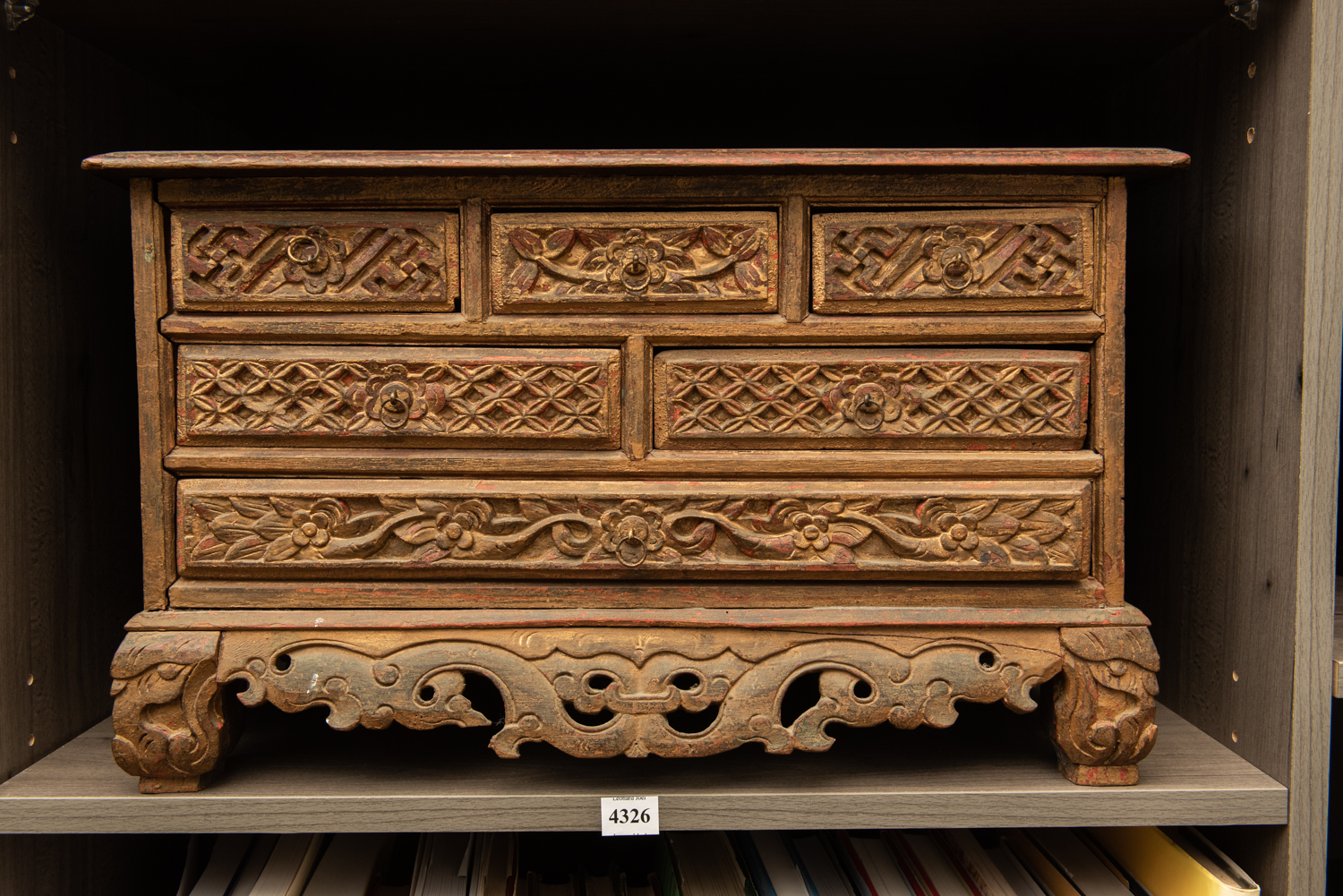 AN INDONESIAN CARVED CHEST OF DRAWERS, 47 CM WIDE, 28 CM HIGH, 26 CM DEPTH, LEONARD JOEL LOCAL DELIVERY SIZE: SMALL