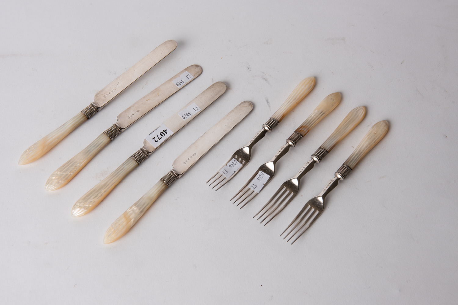 A SET OF FOUR MOTHER OF PEARL MOUNTED SILVER PLATED FRUIT KNIVES AND FORKS, LEONARD JOEL LOCAL DELIVERY SIZE: SMALL