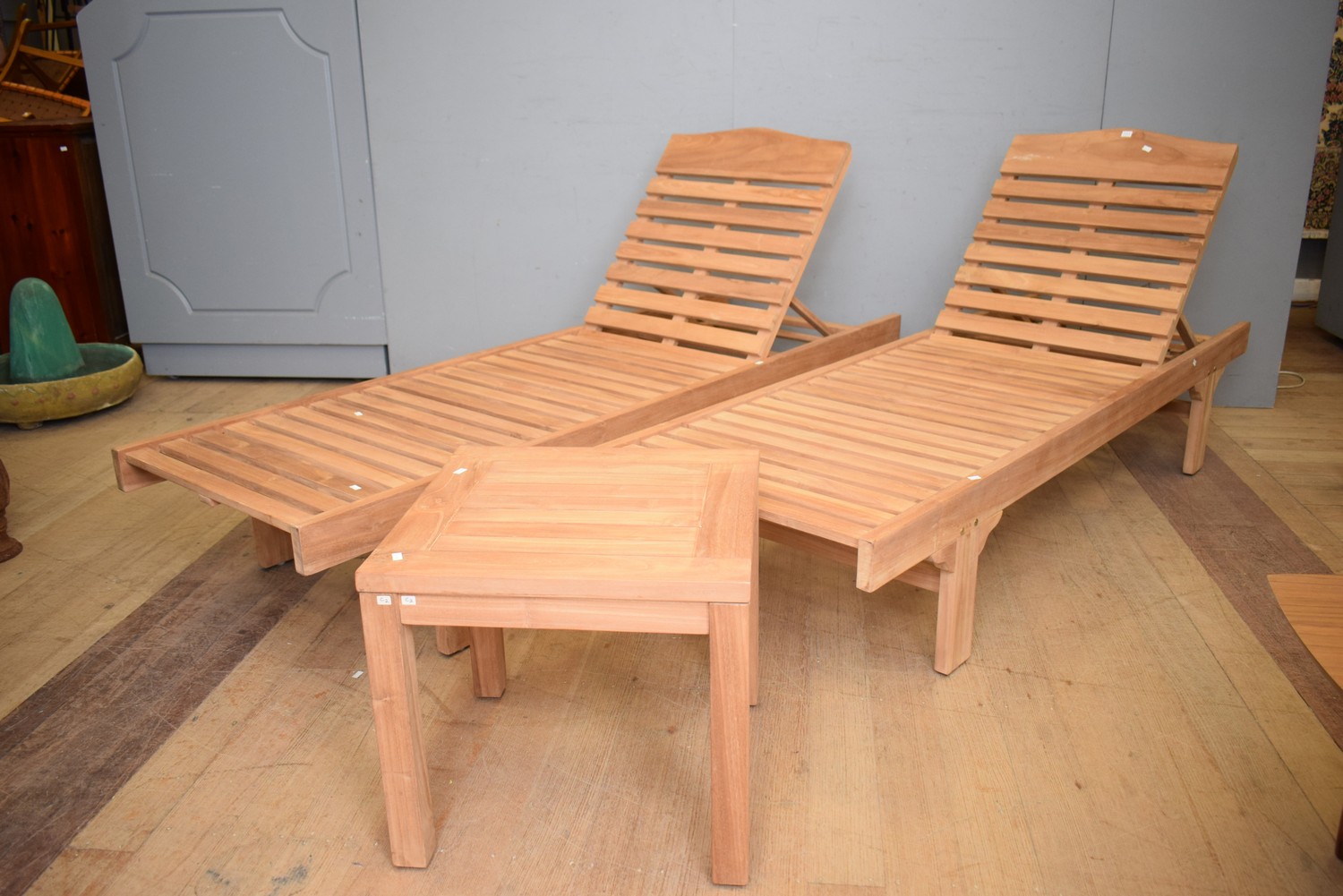 A THREE PIECE OUTDOOR TEAK LOUNGER SET (BENCH 87H X 65W X 200D CM) (PLEASE NOTE THIS HEAVY ITEM MUST BE REMOVED BY CARRIERS AT THE CUSTOMER'S EXPENSE. LEONARD JOEL STAFF CANNOT ASSIST CARRYING THIS ITEM) (X-LARGE ITEM)