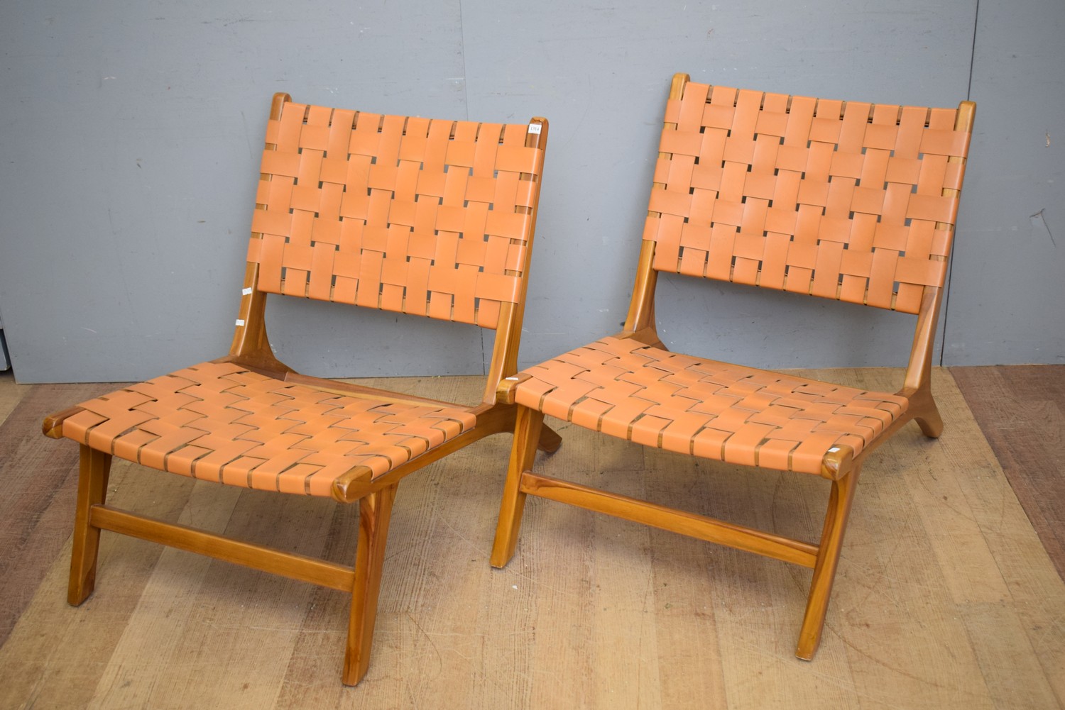 A PAIR OF TEAK AND LEATHER WEAVE ACCENT CHAIRS (72H X 64W X 90D CM) (LEONARD JOEL DELIVERY SIZE: LARGE)