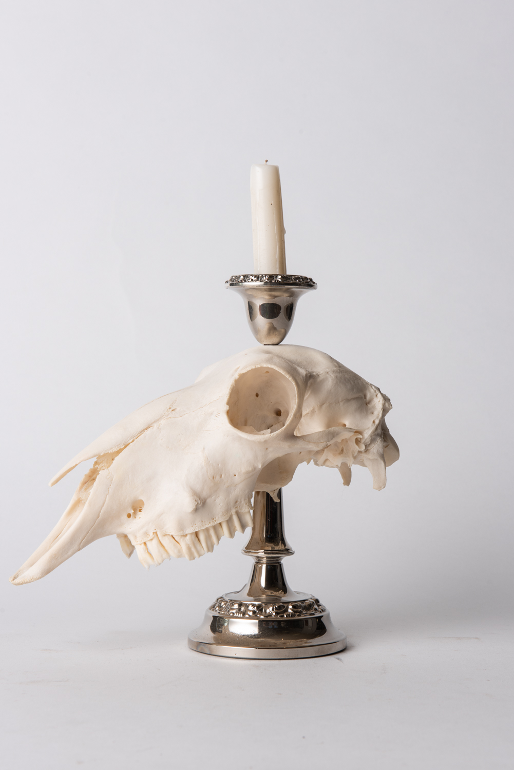 A TAXIDERMIED SHEEP SKULL AND EPNS CANDLESTICK, 30 CM HIGH, LEONARD JOEL LOCAL DELIVERY SIZE: SMALL