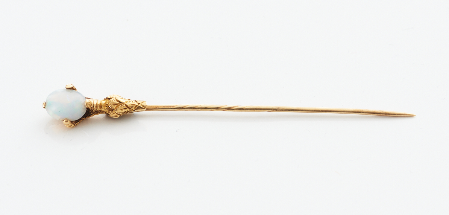 A SOLID OPAL STICK PIN IN A DETAILED CLAW SETTING, IN 18CT GOLD, 2.9GMS