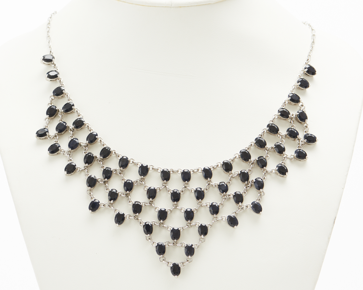 AN AUSTRALIAN SAPPHIRE COLLAR NECKLACE IN SILVER, TOTAL SAPPHIRE WEIGHT 59CTS, TOTAL LENGTH 53CMS