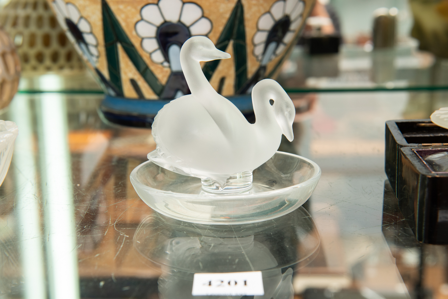 A LALIQUE FROSTED AND CLEAR GLASS 'SWAN' RING HOLDER, H.9CM, LEONARD JOEL LOCAL DELIVERY SIZE: SMALL