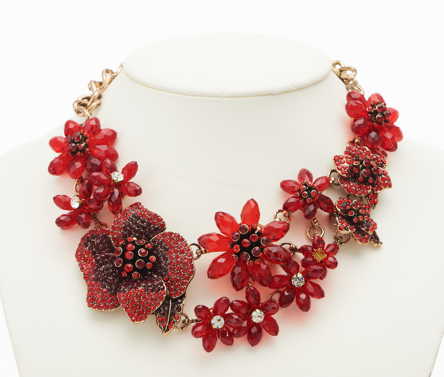 A RED PASTE COSTUME NECKLACE WITH FLORAL MOTIFS, TOTAL LENGTH 44CMS (ADJUSTABLE)