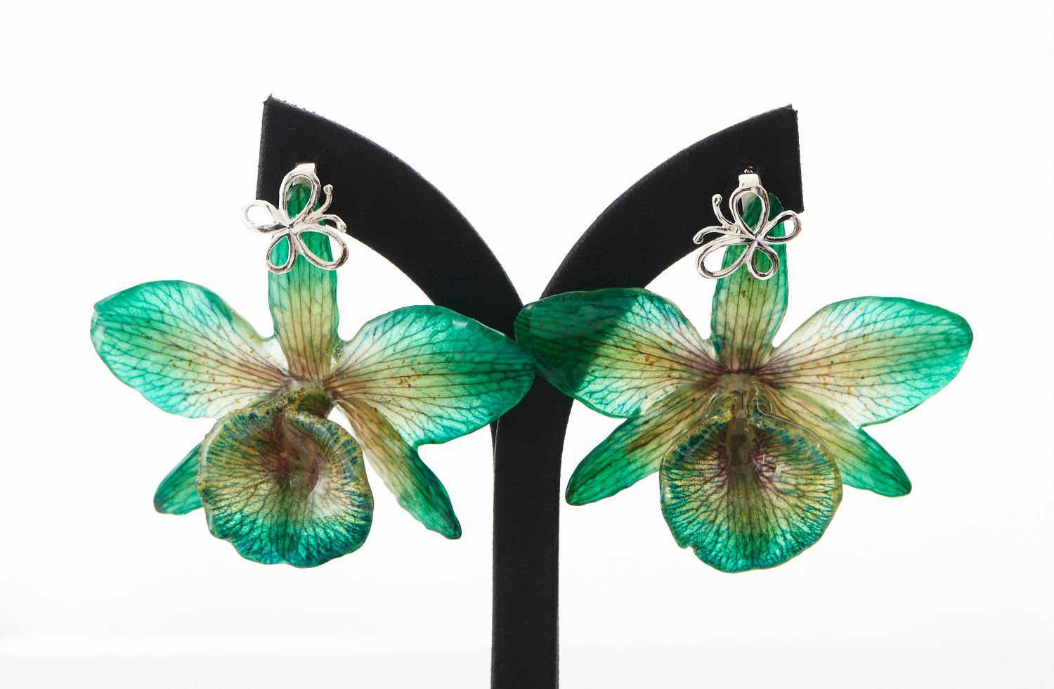 A PAIR OF RESIN ORCHID EARRINGS TO SHEPHERD HOOK FITTINGS IN STERLING SILVER, LENGTH 4.5CM