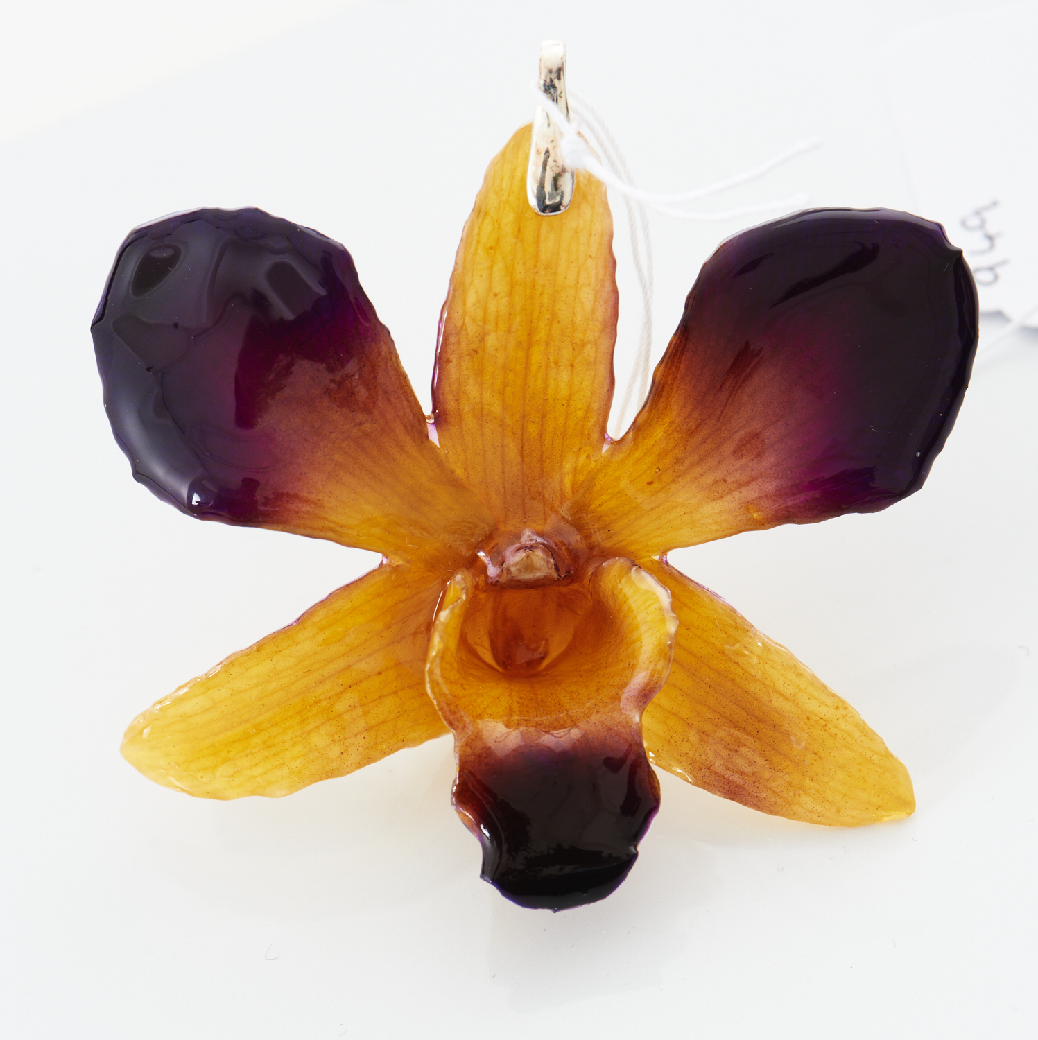 A RESIN ORCHID PENDANT TO A BALE IN STERLING SILVER, LENGTH 6.5CM INCLUDING BALE