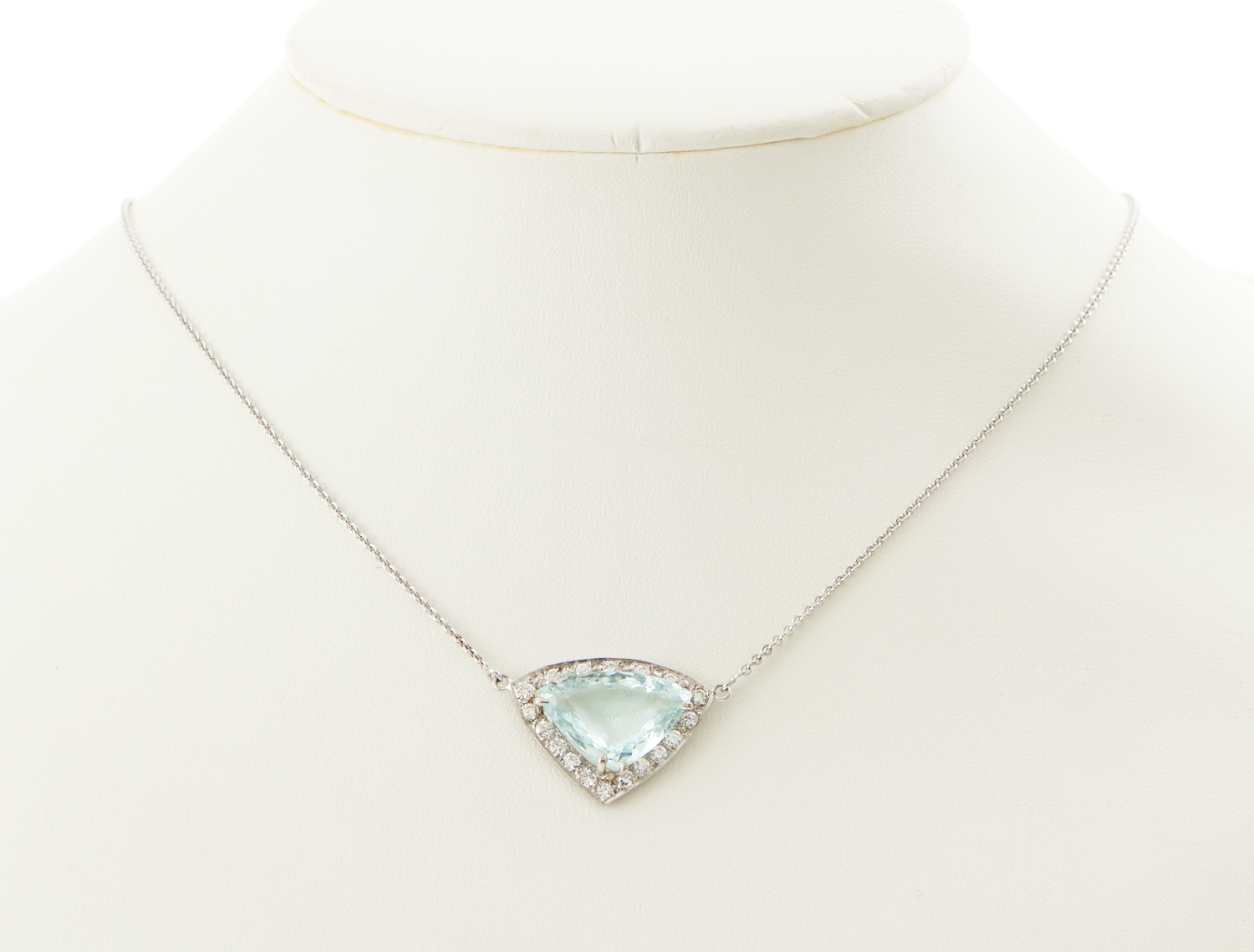 AN AQUAMARINE AND DIAMOND PENDANT NECKLACE IN 18CT WHITE GOLD, FEATURING AN OVAL CUT AQUAMARINE OF 98.29CTS, TO A DIAMOND SET BALE T...