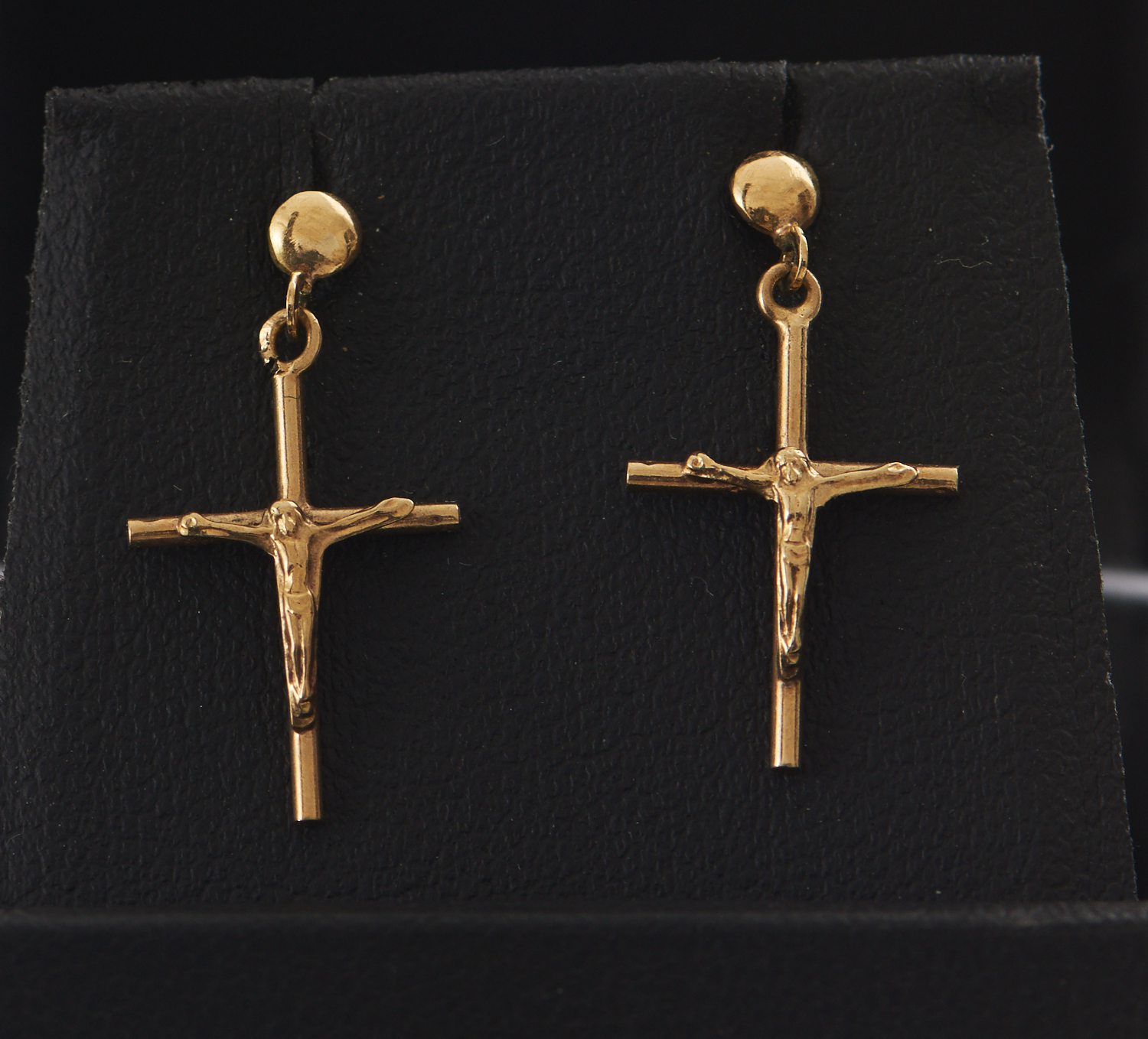 A PAIR OF CRUCIFIX EARRINGS IN 9CT GOLD, TO POST AND BUTTERFLY FITTINGS, LENGTH 2.0CM, BOXED,1.0GMS