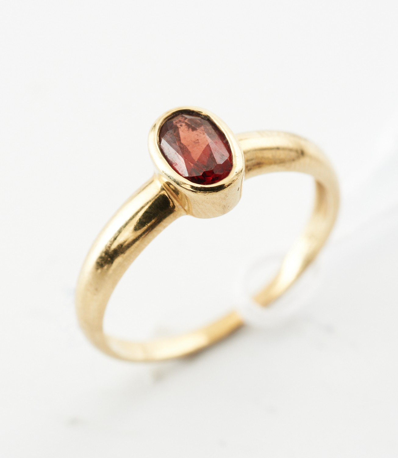 A GARNET RING IN 9CT GOLD, SIZE P, 1.8GMS