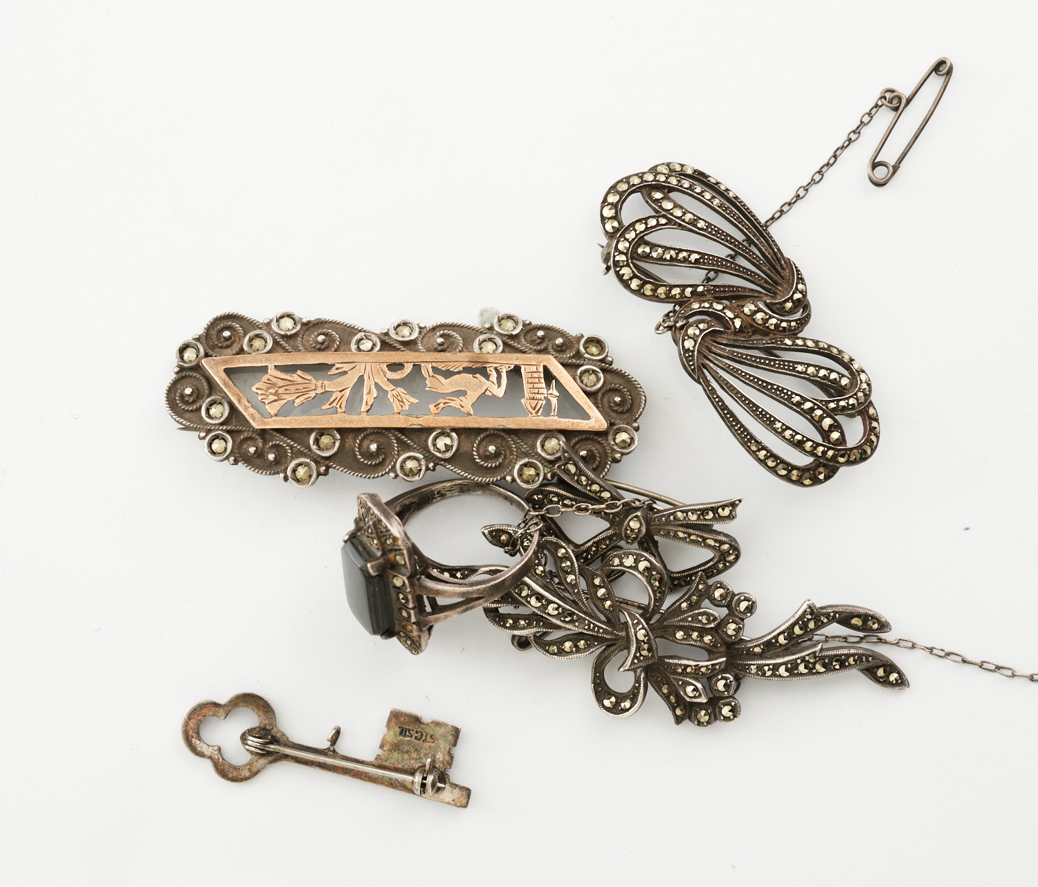 A COLLECTION OF SIX VINTAGE MARCASITE JEWELLERY INCLUDING BROOCHES AND RING