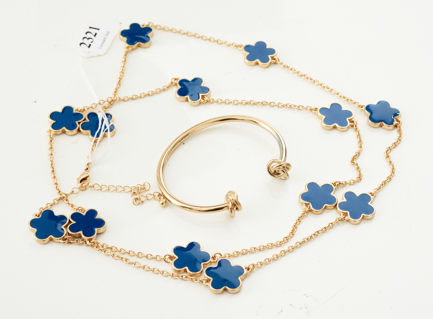 A BLUE ENAMEL LONG COSTUME NECKLACE IN BASE METAL, TOGETHER WITH A KNOT DESIGN CUFF BANGLE
