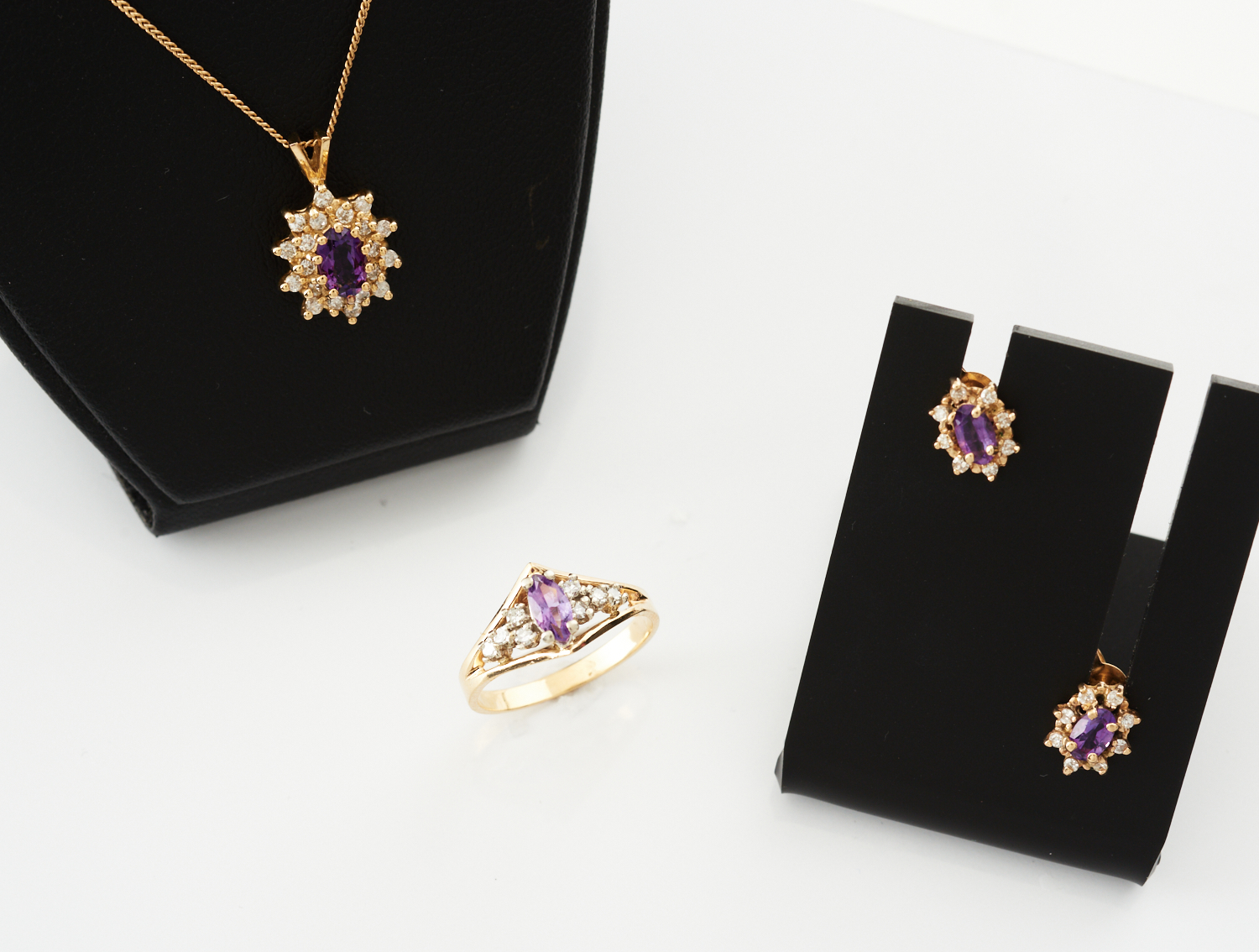 AN AMETHYST AND DIAMOND JEWELLERY SUITE IN 10CT GOLD, COMPRISING A RING (SIZE K), A PENDANT WITH CHAIN AND A PAIR OF STUD EARRINGS, TO POST AND BUTTERFLY FITTINGS, TOTAL WEIGHT 5.9GMS