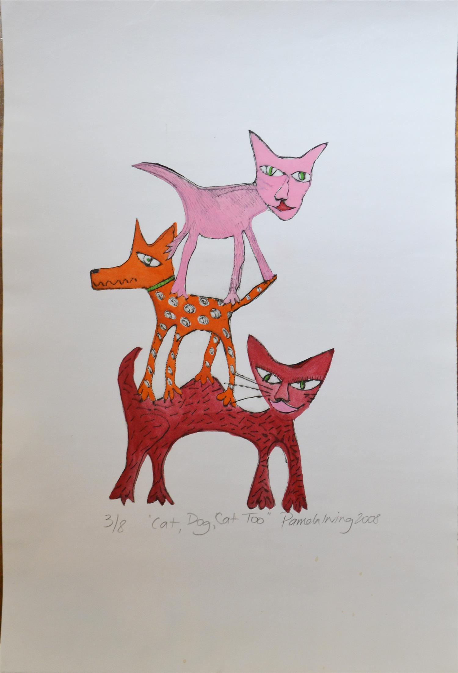 PAMELA IRVING, CAT, DOG, CAT TOO 2008, ETCHING WITH HAND COLOURING 3/8, UNFRAMED, 50 X 33CM, LEONARD JOEL DELIVERY SIZE: SMALL