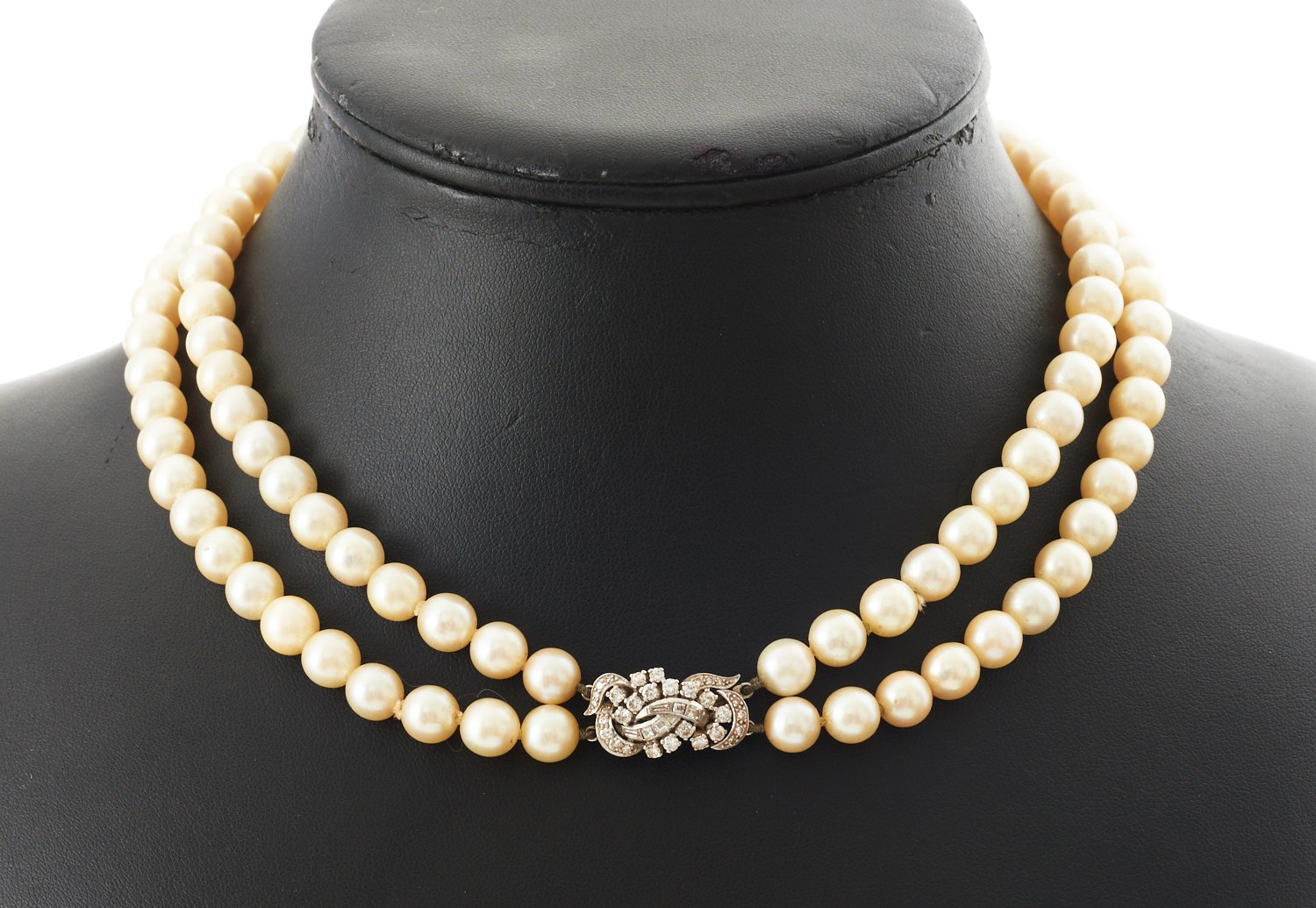A DOUBLE STRAND OF CULTURED PEARLS, MEASURING 7.0 TO 8.0MM, TO A DIAMOND CLASP IN 14CT WHITE GOLD, LENGTH 39.5CM INCLUDING CLASP