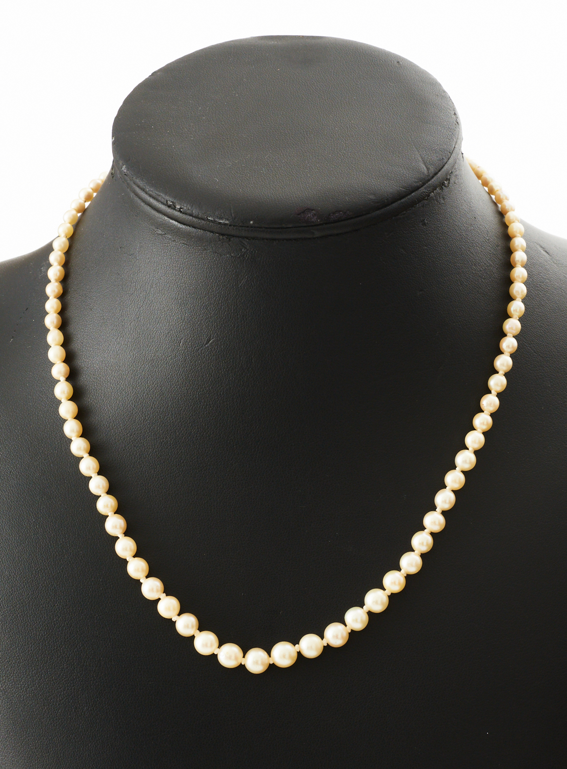 Each pearl knotted separately; pearls showing cream white hues; natural blemishes to skin; medium to good lustre.