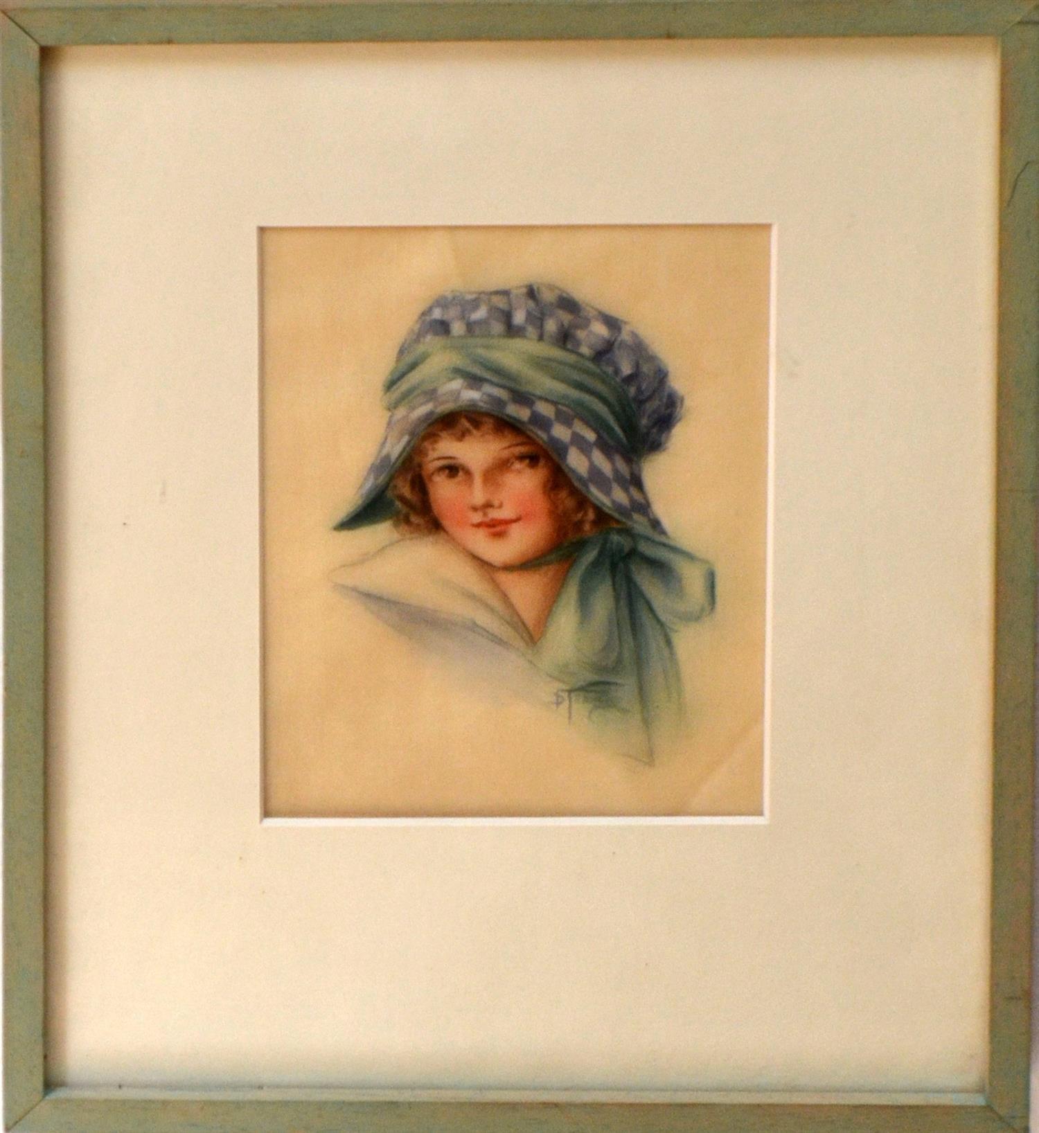 DOROTHEA FRANCIS, PORTRAIT OF A GIRL IN BONNET, INK ON SILK, 17 X 13CM, FRAME SIZE: 33 X 26CM, LEONARD JOEL DELIVERY SIZE: SMALL, CONDITION: GOOD, CREASE LOWER RIGHT