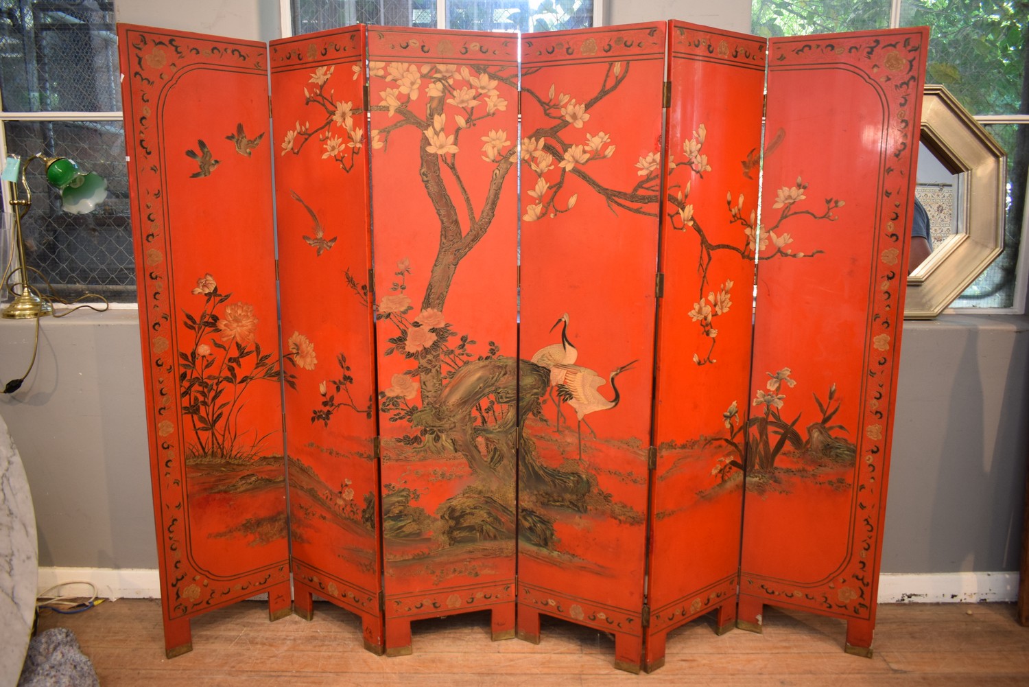 AN ORIENTAL RED SIX PANEL SCREEN (183H X 41W EACH PANEL) (PLEASE NOTE THIS HEAVY ITEM MUST BE REMOVED BY CARRIERS AT THE CUSTOMER'S EXPENSE. LEONARD JOEL STAFF CANNOT ASSIST CARRYING THIS ITEM) (X-LARGE ITEM)