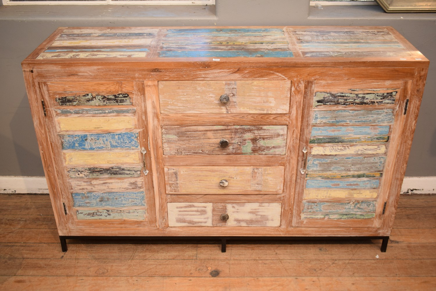 A LARGE COASTAL VINTAGE STYLE RECLAIMED TIMBER SIDEBOARD (94H X 153W X 47D CM) (PLEASE NOTE THIS HEAVY ITEM MUST BE REMOVED BY CARRIERS AT THE CUSTOMER'S EXPENSE. LEONARD JOEL STAFF CANNOT ASSIST CARRYING THIS ITEM) (X-LARGE ITEM)