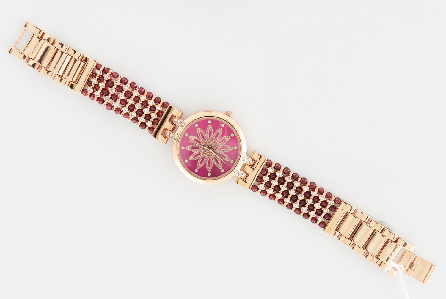 A DECORATIVE QUARTZ MOVEMENT WATCH, THE BANDS COMPRISING GARNET BEADS AND PASTE