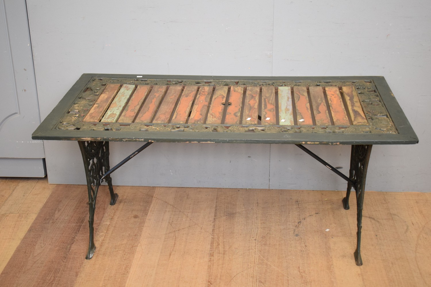 A RUSTIC CAST IRON AND TIMBER TABLE (63H x 146W x 76D CM) (PLEASE NOTE THIS HEAVY ITEM MUST BE REMOVED BY CARRIERS AT THE CUSTOMER'S EXPENSE. LEONARD JOEL STAFF CANNOT ASSIST CARRYING THIS ITEM) (X-LARGE ITEM)