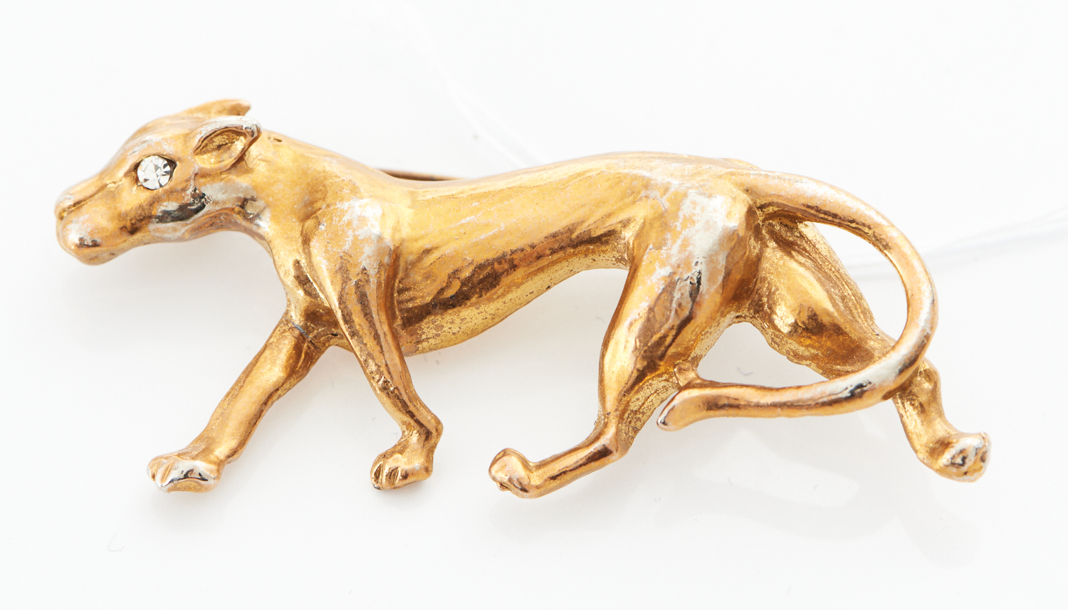 A LIONESS COSTUME BROOCH IN GILT, LENGTH 7CMS
