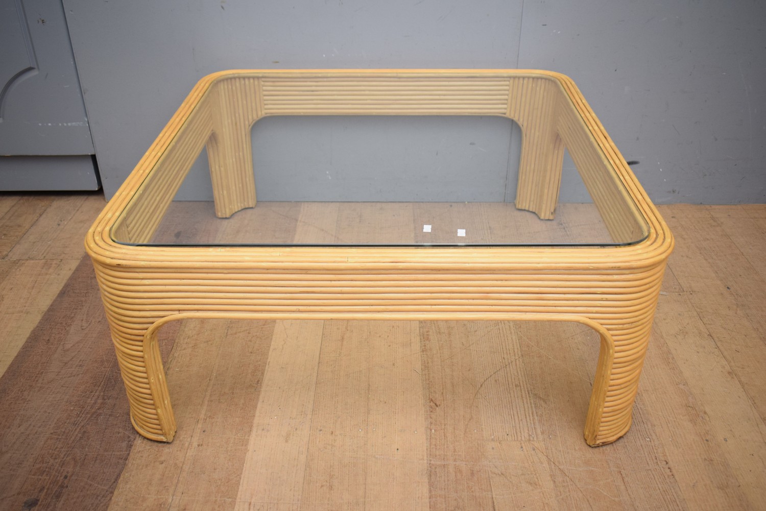 A CANE AND GLASS SQUARE COFFEE TABLE (41H x 96W x 96D CM) (LEONARD JOEL DELIVERY SIZE: LARGE)