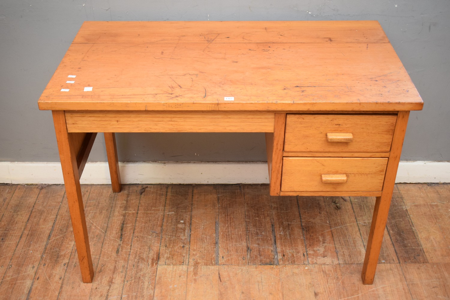 A MID-CENTURY TIMBER TWO DRAWER DESK (73H x 103W x 58D CM) (LEONARD JOEL DELIVERY SIZE: LARGE)