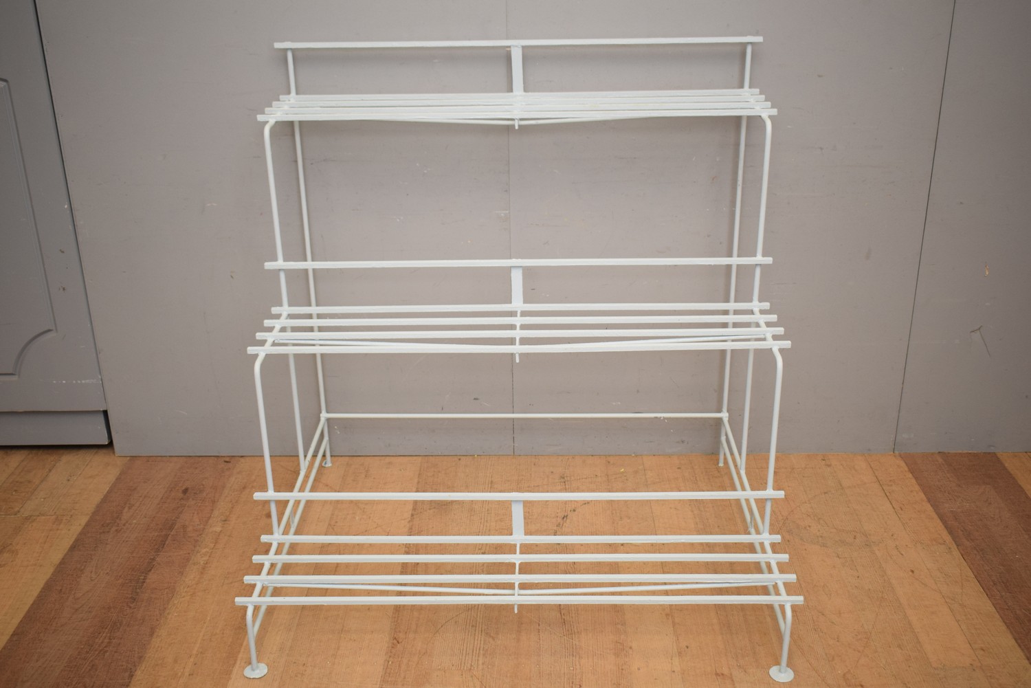 A LARGE WROUGHT IRON THREE TIER PLANT STAND (120H x 120W x 93D CM) (PLEASE NOTE THIS HEAVY ITEM MUST BE REMOVED BY CARRIERS AT THE CUSTOMER'S EXPENSE. LEONARD JOEL STAFF CANNOT ASSIST CARRYING THIS ITEM) (X-LARGE ITEM)