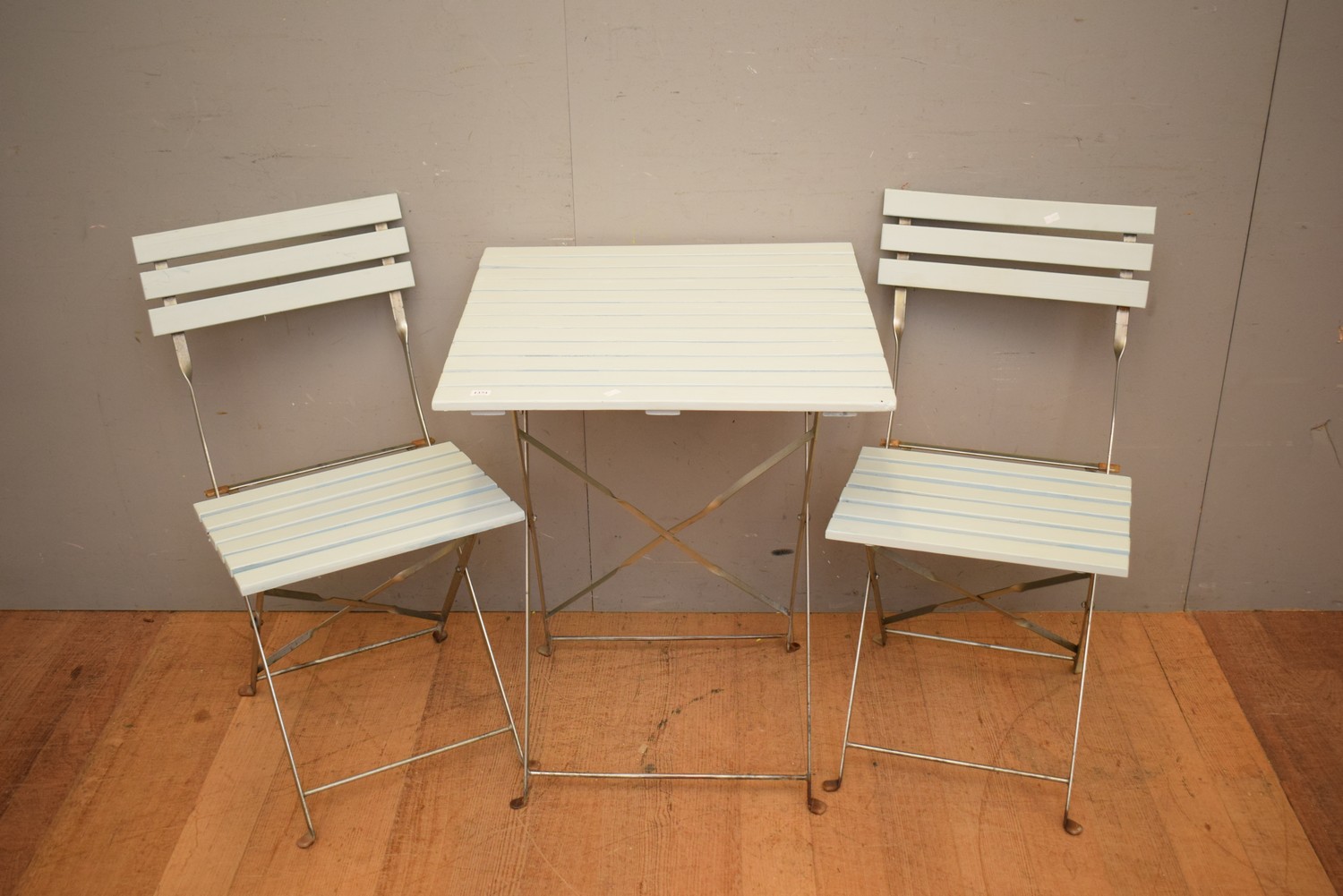 A TIMBER & METAL THREE PIECE OUTDOOR SETTING (A/F) (TABLE 74H x 60W x 60D CM) (LEONARD JOEL DELIVERY SIZE: LARGE)