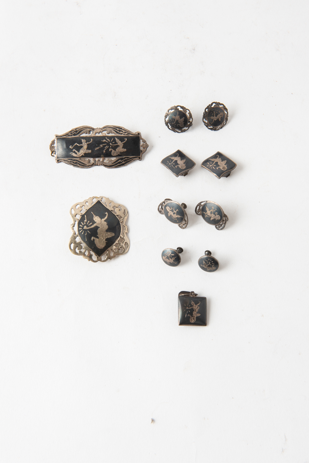 A COLLECTION OF VINTAGE THAI SILVER BROOCHES, EARRINGS AND A NECKLACE, LEONARD JOEL LOCAL DELIVERY SIZE: SMALL