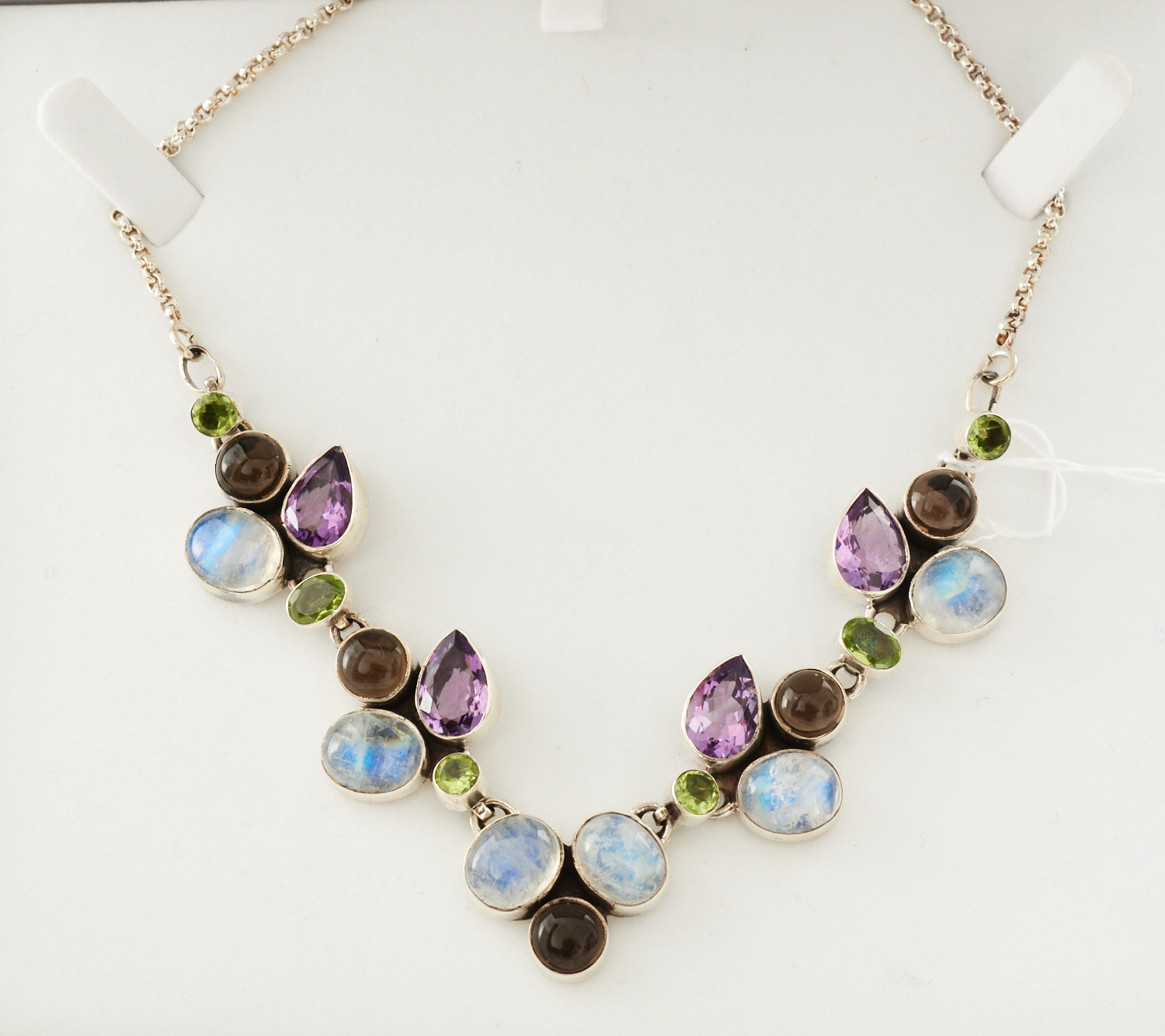 A PERIDOT AMETHYST AND MOONSTONE NECKLACE IN STERLING SILVER