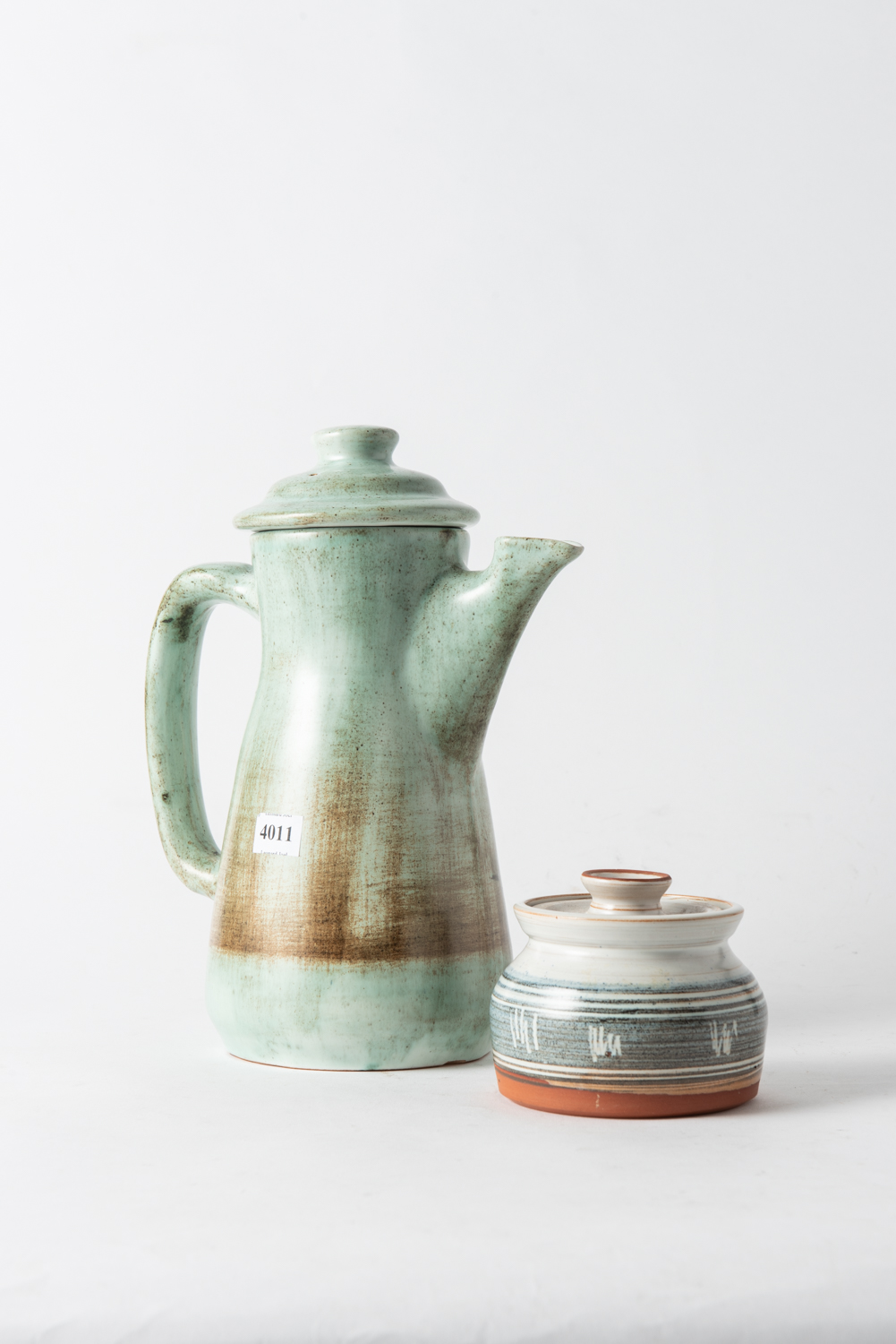PHYL DUNN GREEN SIGNED COFFEE POT AND SUGAR BOWL (29 CM H), LEONARD JOEL LOCAL DELIVERY SIZE: SMALL