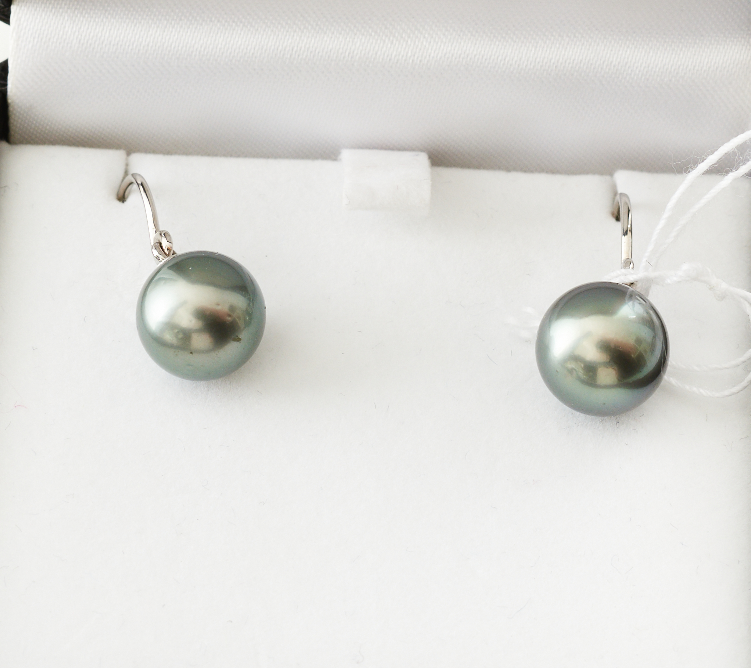 A PAIR OF TAHITIAN PEARL EARRINGS TO HOOK FITTINGS IN 18CT RHODIUM PLATED GOLD, 2.2CM DROP.