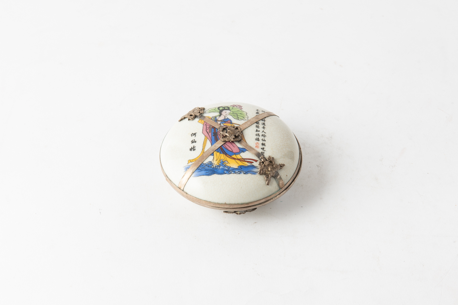 A GOLDFIELDS LIDDED BOX WITH EROTIC SCENE, SILVER BOUND (UNTESTED), 11 CM DIAMETER, LEONARD JOEL LOCAL DELIVERY SIZE: SMALL