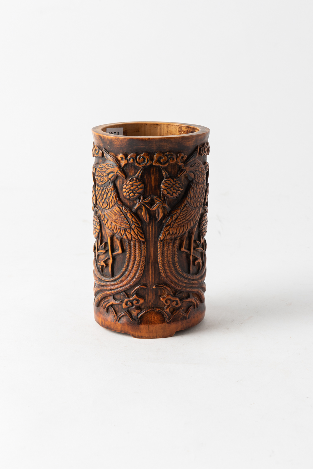 A BAMBOO BRUSH POT WITH PHOENIX AND DRAGON, MARKED TO BASE, 18.5 CM HIGH, LEONARD JOEL LOCAL DELIVERY SIZE: SMALL