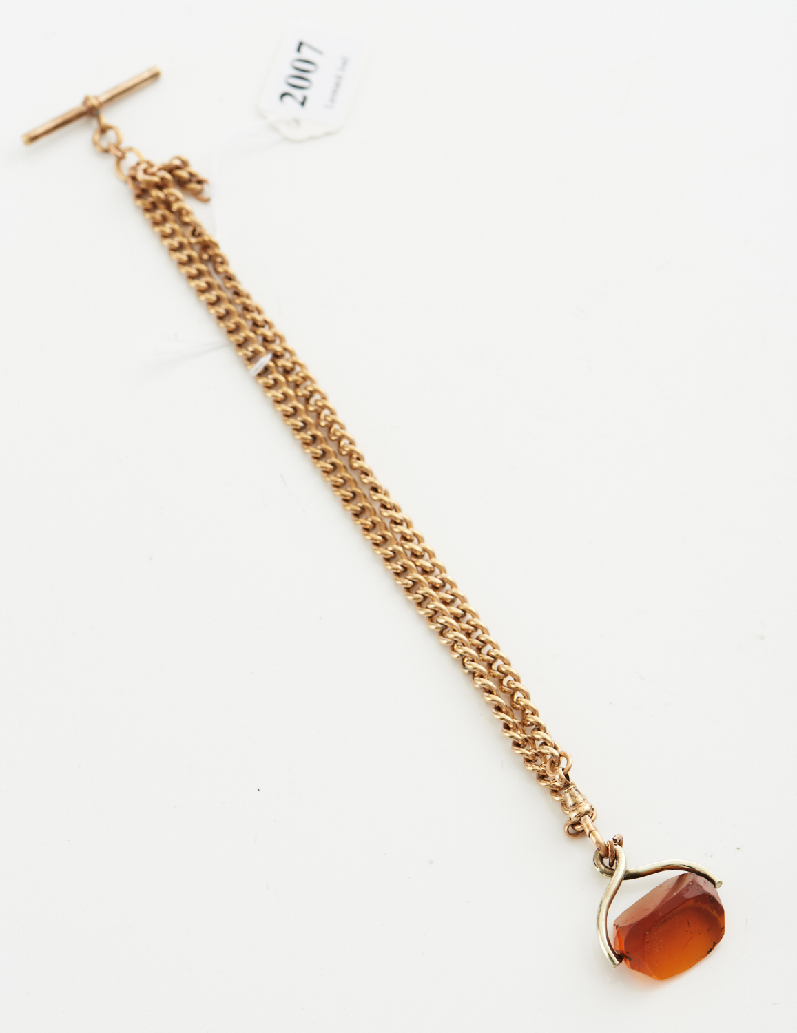 A ROLLED GOLD WATCH CHAIN WITH T-BAR AND PASTE SPINNER