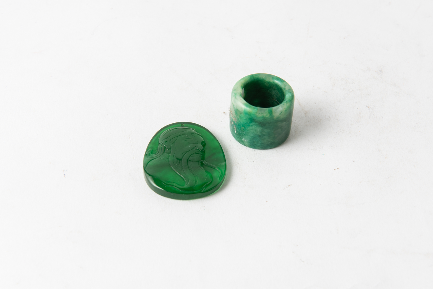 A TREATED JADE ARCHER'S RING TOGETHER WITH HARD STONE PENDANT, LEONARD JOEL LOCAL DELIVERY SIZE: SMALL