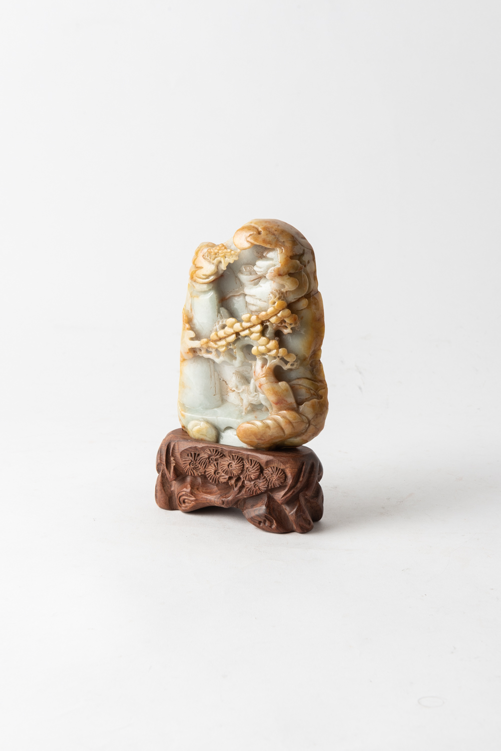 A JADEITE CARVING ON WOODEN STAND, 21.5 CM TOTAL HEIGHT, LEONARD JOEL LOCAL DELIVERY SIZE: SMALL