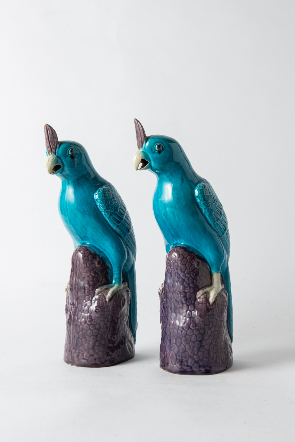 A PAIR OF CHINESE GLAZED POTTERY PARROTS, H.35CM, LEONARD JOEL LOCAL DELIVERY SIZE: SMALL
