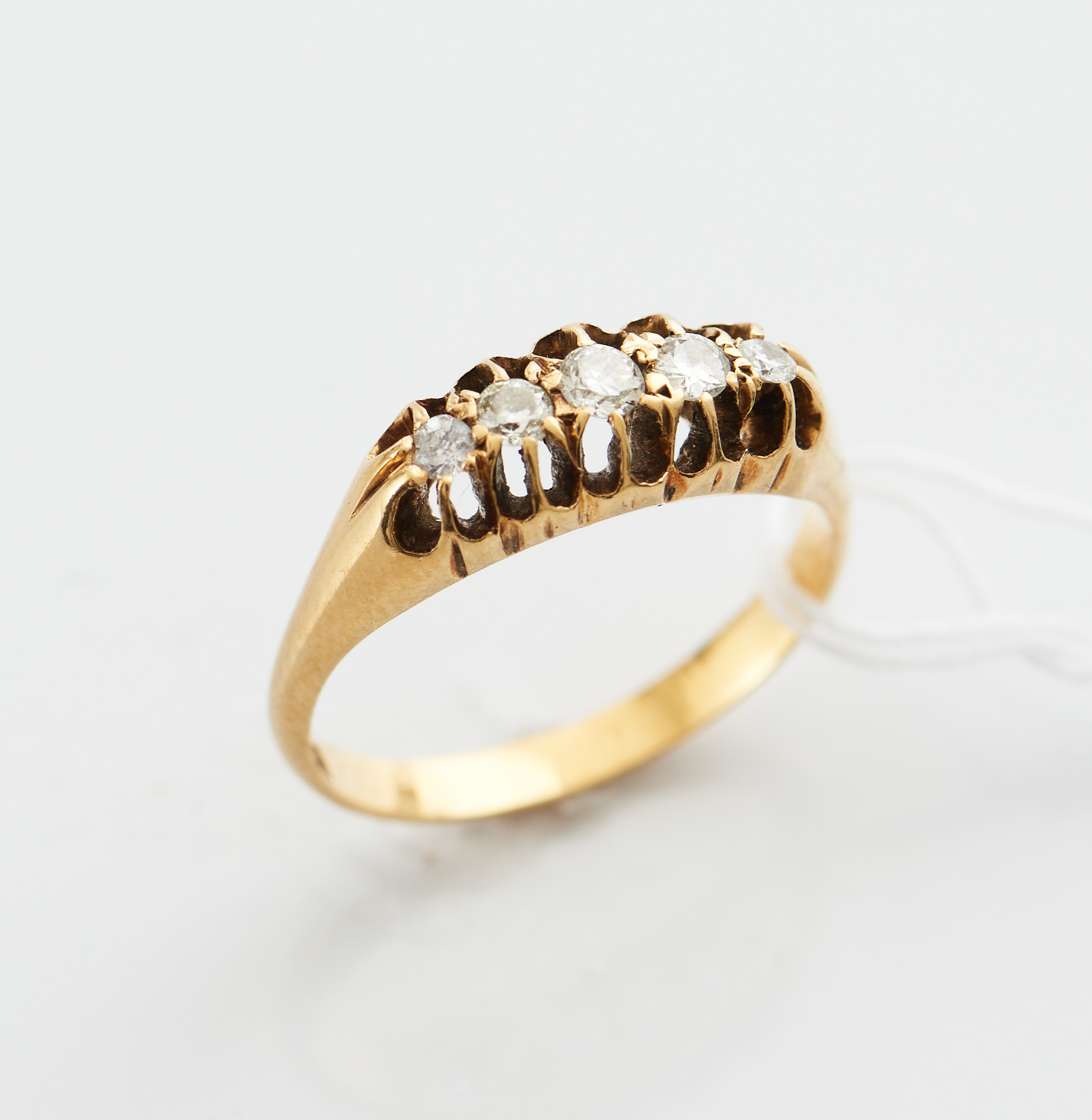 A FIVE STONE DIAMOND RING IN 18CT GOLD, APPROXIMATE TOTAL DIAMOND WEIGHT 0.20CT, SIZE N, 4.0GMS