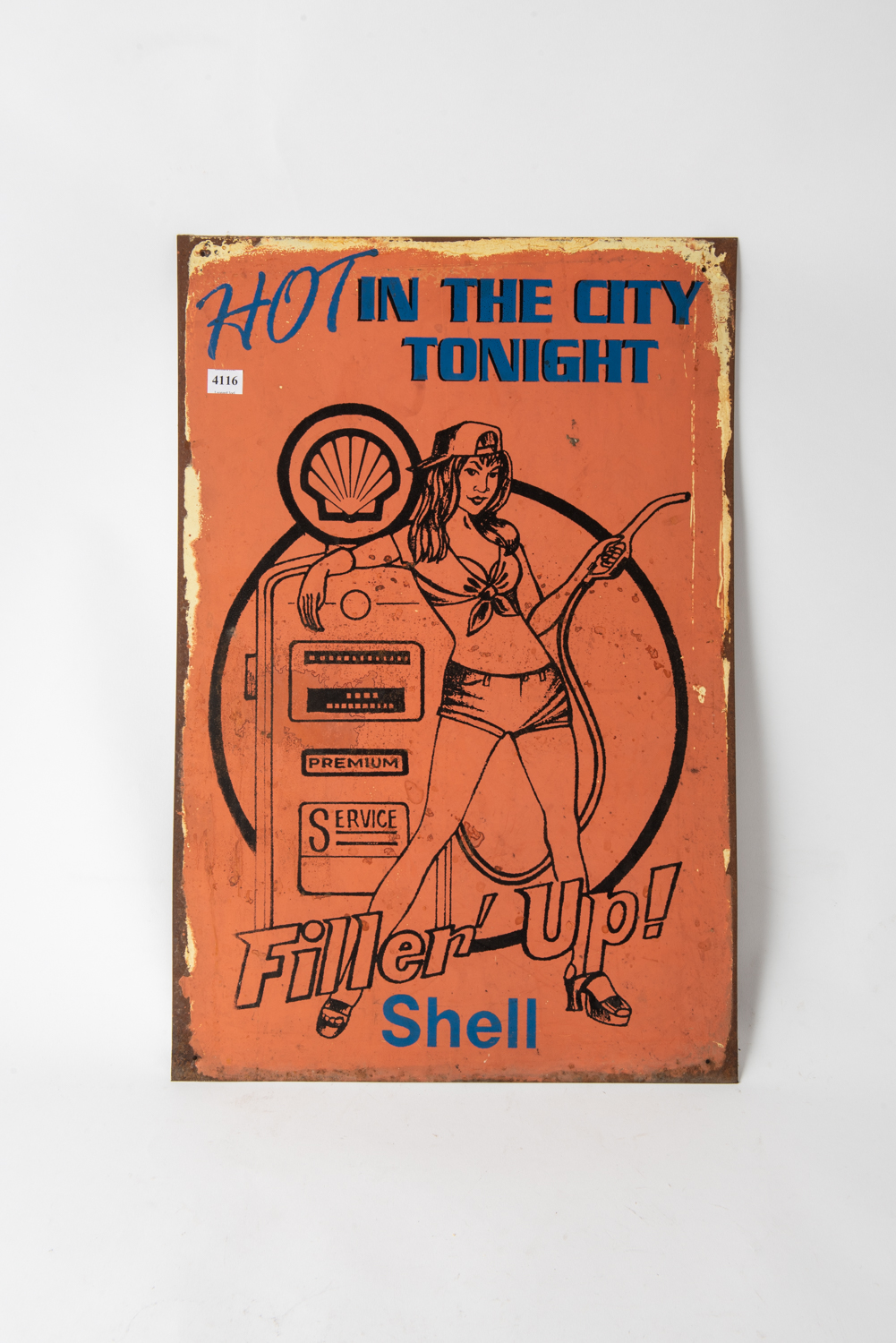 AN ENAMEL SIGN, 'HOT IN THE CITY TONIGHT, FILL WITH SHELL', 60 X 40CM, LEONARD JOEL LOCAL DELIVERY SIZE: SMALL