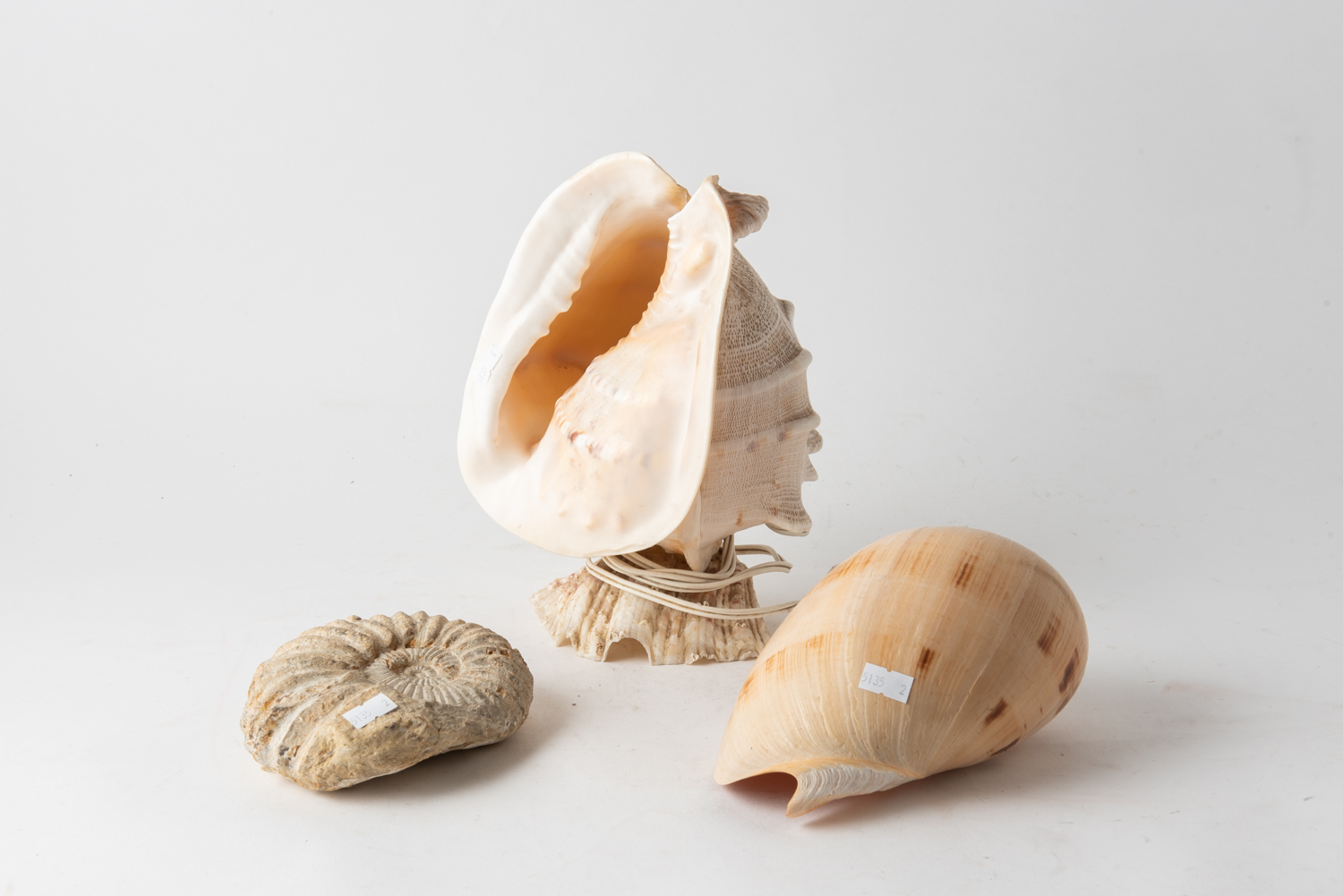 A VINTAGE SHELL LAMP, ONE OTHER SHELL AND A FOSSIL SPECIMEN, LEONARD JOEL LOCAL DELIVERY SIZE: SMALL