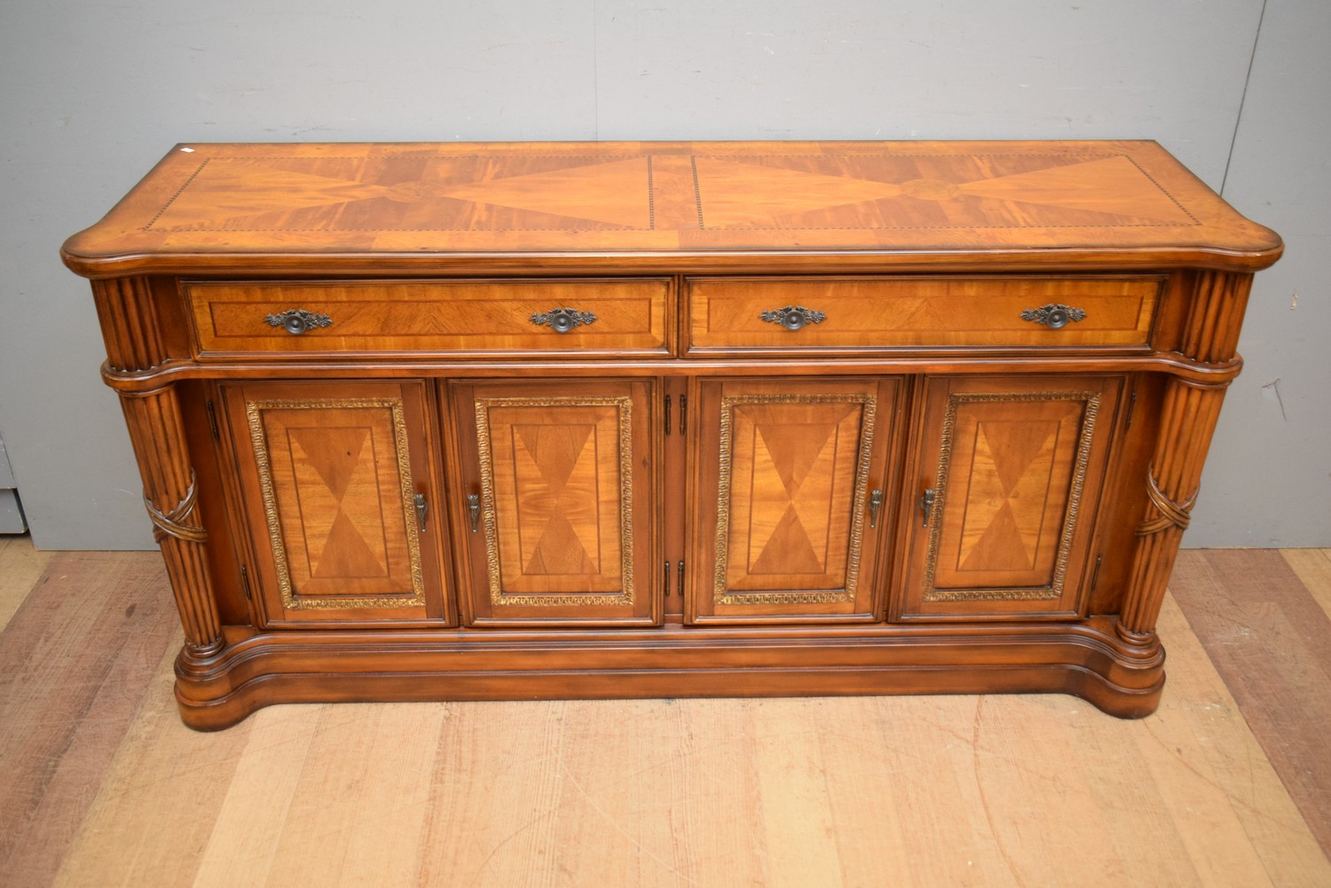 A DECORATIVE PARQUETRY INLAID SIDEBOARD (88H x 172W x 49D CM) (PLEASE NOTE THIS HEAVY ITEM MUST BE REMOVED BY CARRIERS AT THE CUSTOMER'S EXPENSE. LEONARD JOEL STAFF CANNOT ASSIST CARRYING THIS ITEM) (X-LARGE ITEM)