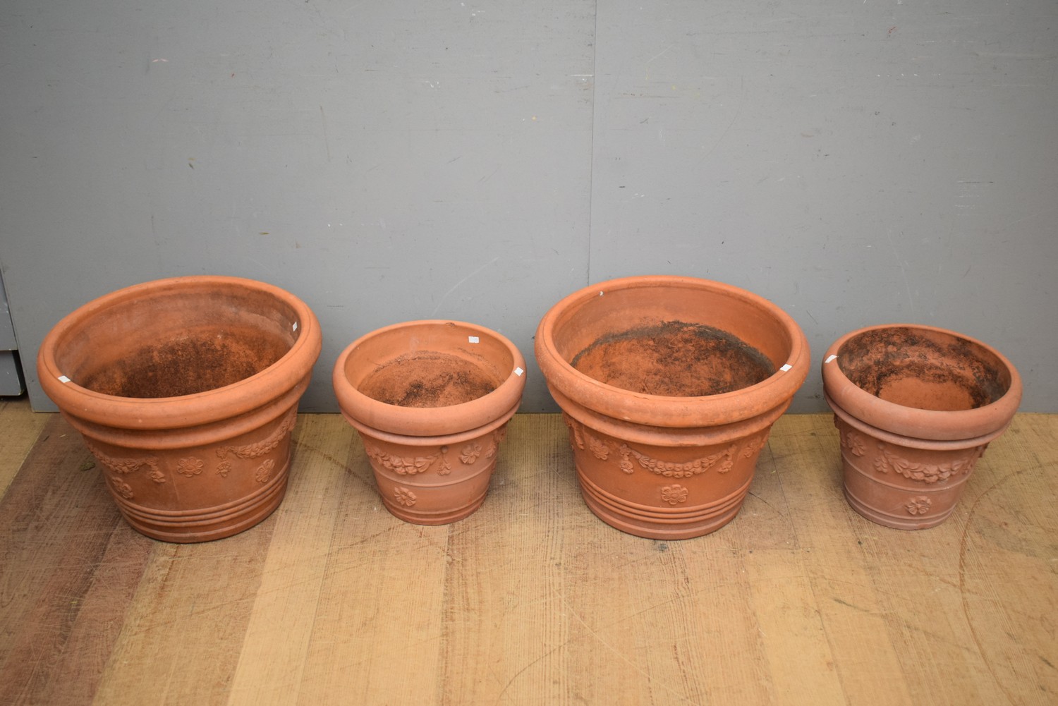 A COLLECTION OF FOUR TERRACOTTA POTS (36H x 51D CM) (PLEASE NOTE THIS HEAVY ITEM MUST BE REMOVED BY CARRIERS AT THE CUSTOMER'S EXPENSE. LEONARD JOEL STAFF CANNOT ASSIST CARRYING THIS ITEM) (X-LARGE ITEM)