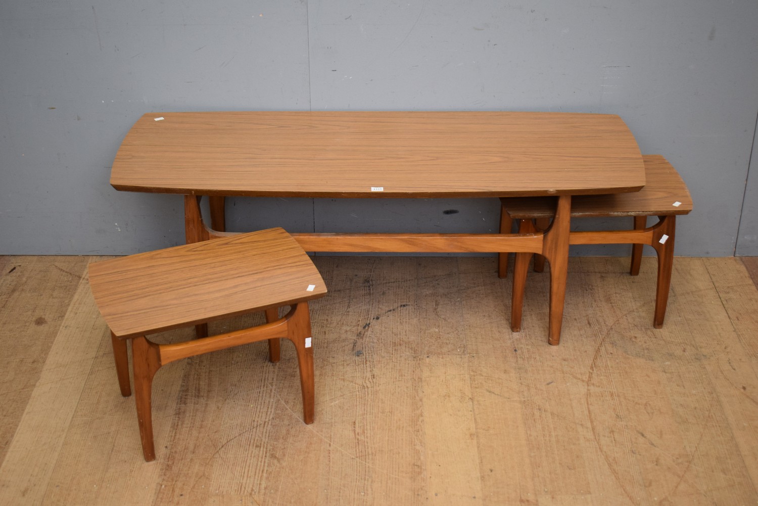 A MID-CENTURY COFFEE TABLE AND TWO MATCHING SIDE TABLES (A/F) (42H x 120W x 45D CM) (LEONARD JOEL DELIVERY SIZE: LARGE)