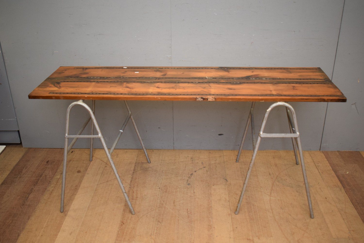 A 1940S BESPOKE PINE TOPPED AND METAL BASED TRESTLE TABLE (74H X 164W X 58D CM)