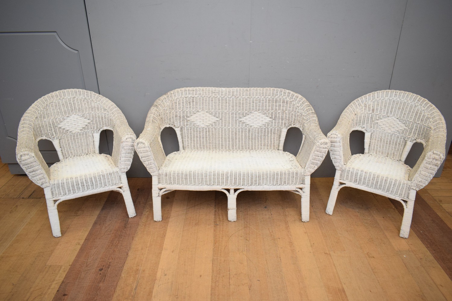 A THREE PIECE SET OF 1950S PAINTED WHITE WOVEN CANE CHAIRS AND LOUNGE ( 83H X 130W X 63D CM) (LEONARD JOEL DELIVERY SIZE: LARGE)