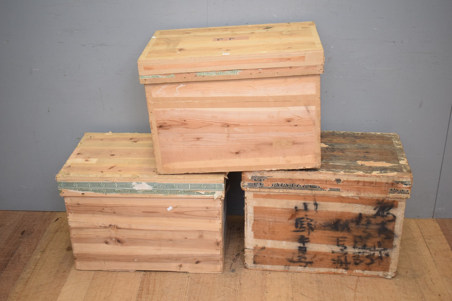 A GROUP OF THREE 1940S JAPANESE PINE TEA CHESTS (48H x 68W x 43D CM) (LEONARD JOEL DELIVERY SIZE: LARGE)